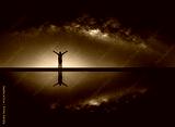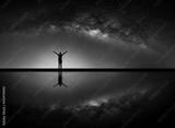 Landscape with Milky way galaxy. Night sky with stars and silhouette happy man on the mountain. Long exposure photograph.