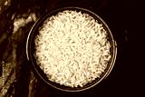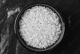 Bowl of uncooked brown rice. Raw grains in ceramic container. Simple healthy food. Ingredient for cooking background. Close-up of dry rice. Natural vegetarian product. Kitchen preparation view