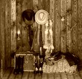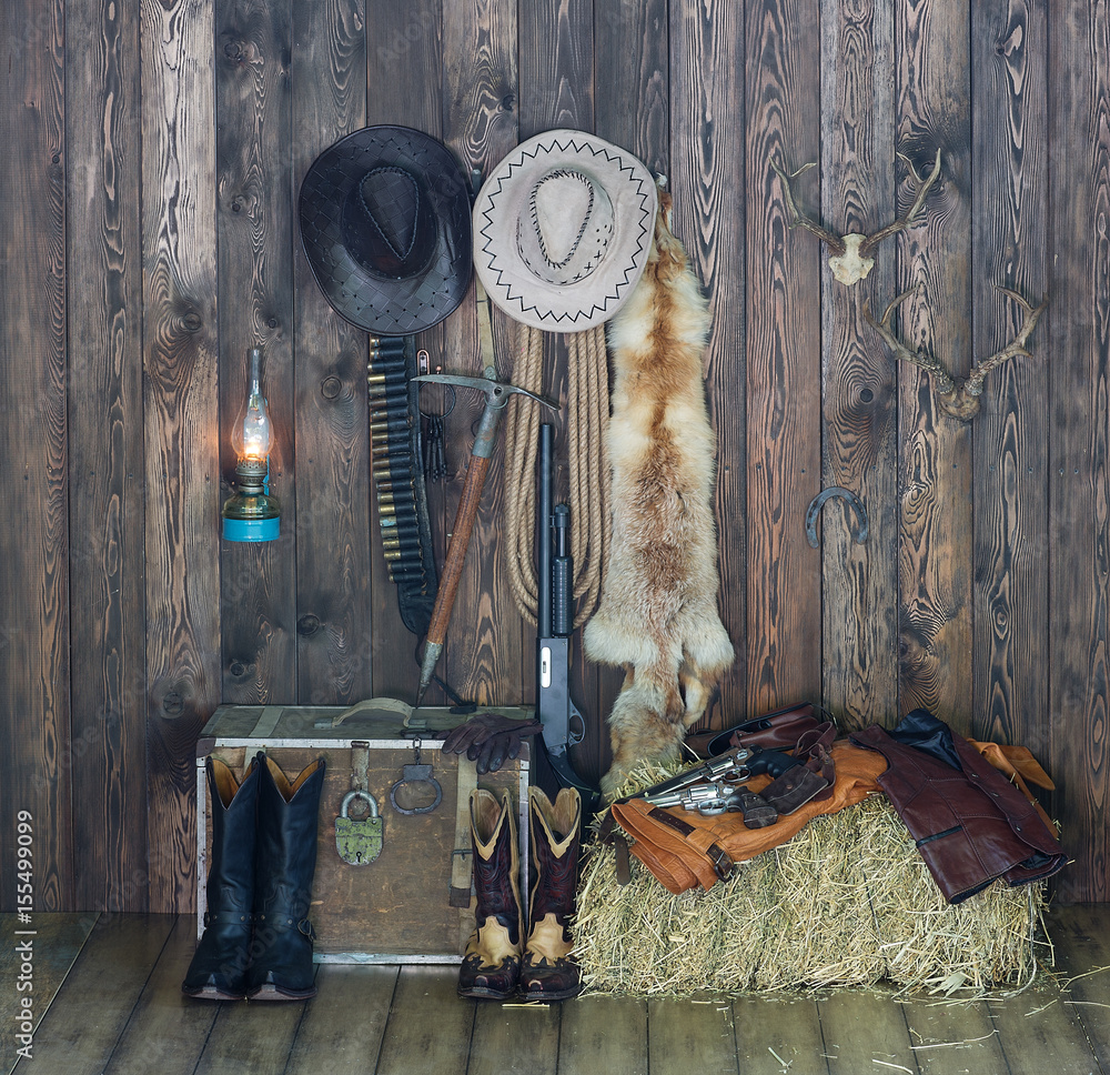 Cowboy hat, boots and weapons on the background of the old barn.Wild west, cowboy,Vintage