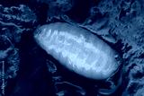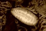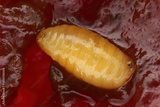 Pupa of the European cherry fruit fly (Rhagoletis cerasi) in red cherry fruit. Commonly found worms in fruits. Macro photography with great depth of field and detail.