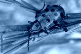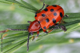 Spotted asparagus beetle (Crioceris duodecimpunctata) on asparagus. Pest of cultivated vegetables.