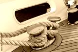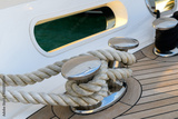 Bollard (cleat) with mooring line on superyacht. Mooring gear on yacht. Superyacht equipment. Side view.