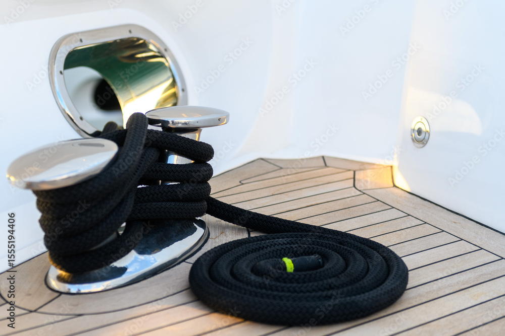 Mooring line coiled on deck on superyacht. Mooring gear on yacht. Superyacht equipment.