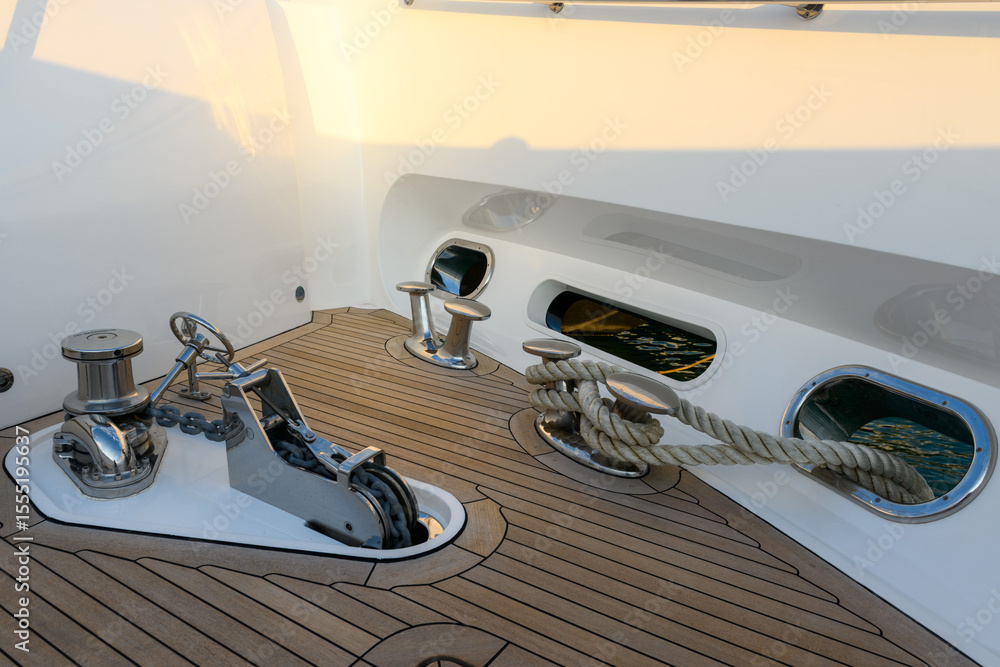 Bollard (cleat) with mooring line on superyacht. Mooring gear on yacht. Superyacht equipment.