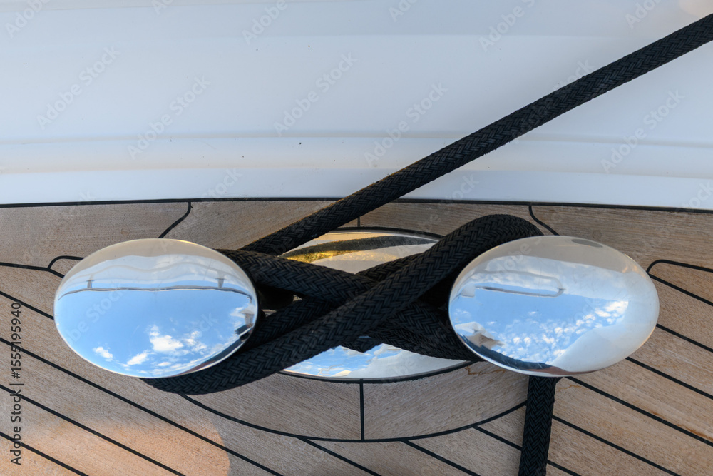Bollard (cleat) with mooring line on superyacht. Mooring gear on yacht. Superyacht equipment. Top view.