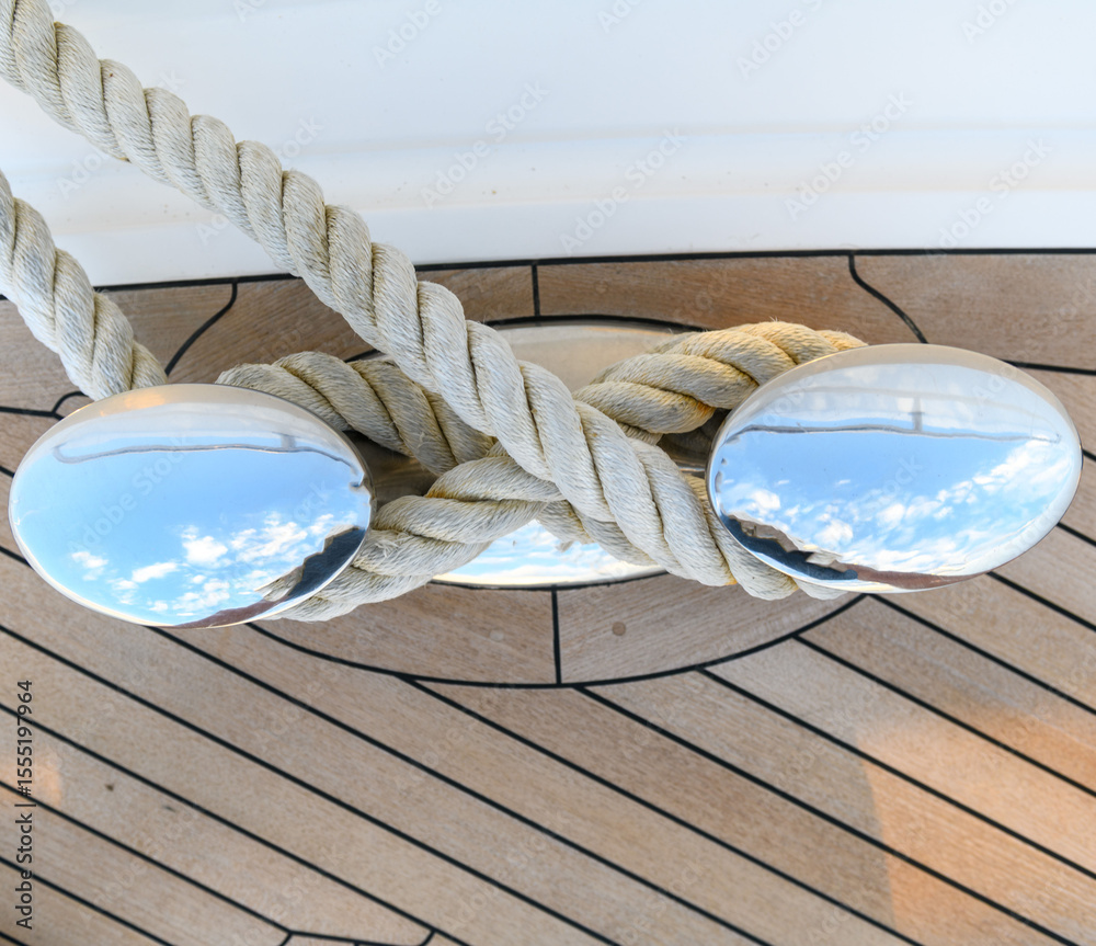 Bollard (cleat) with mooring line on superyacht. Mooring gear on yacht. Superyacht equipment. Side view.