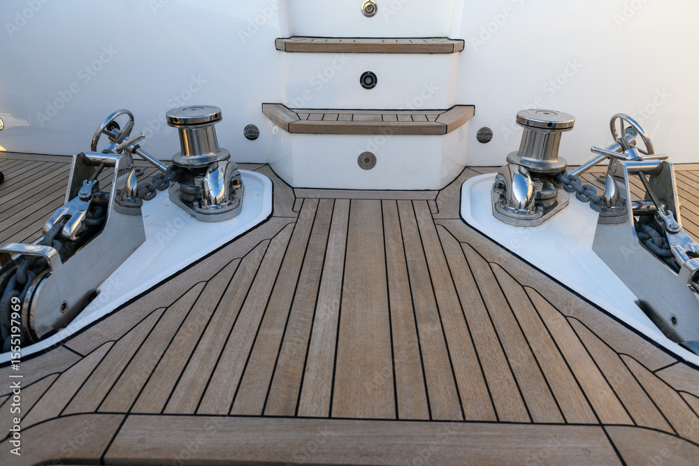 Teak stairs ladder on luxury yacht. Elements of yacht construction. Superyacht concept.