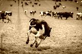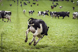 Happy cow jumping down a green field