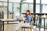 Asian female successful employee business freelance is holding document to reading business data and financial chart while working with laptop in the workplace office.