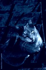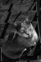 Młody szary kociak siedzi na schodach i patrzy do góry.