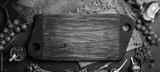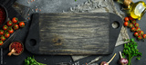 Food background. Spices, herbs and kitchen tools. Top view. free space for your text. Rustic style.