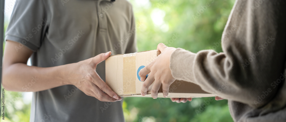 Happy smiling woman receives boxes parcel from courier in front house. Delivery man send deliver express. online shopping, paper containers, takeaway, postman, delivery service, packages