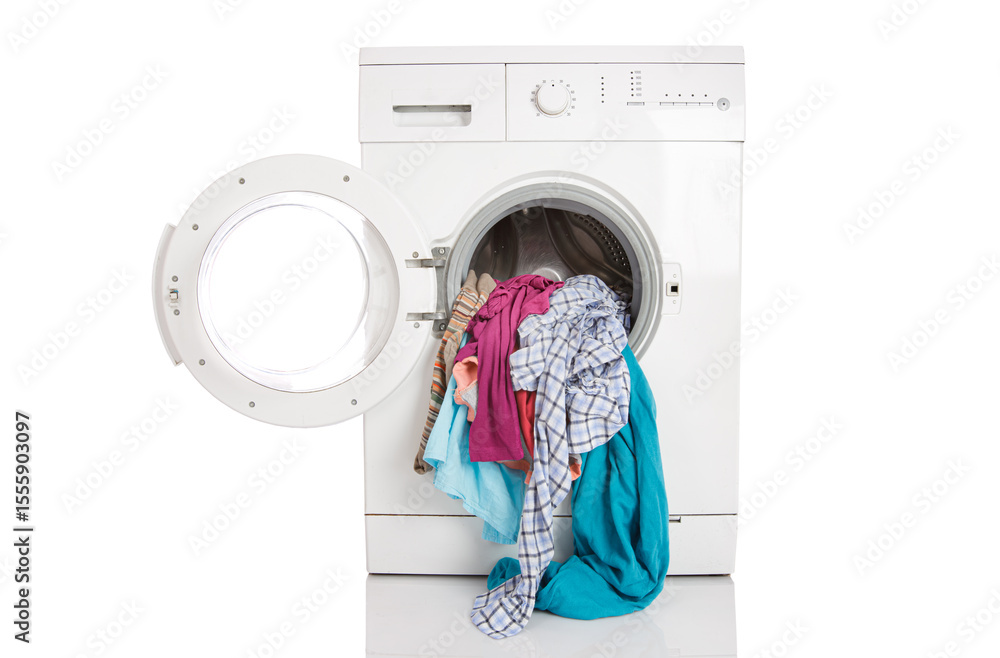 Washing machine with clean linen on a white background...