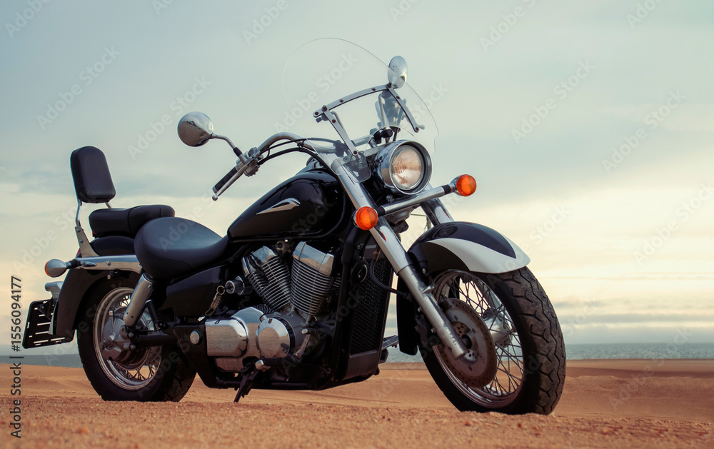 Adventure motorcycle in the Namib Desert – premium stock photo capturing off-road freedom, solitude, and the raw beauty of desert exploration and untamed travel.