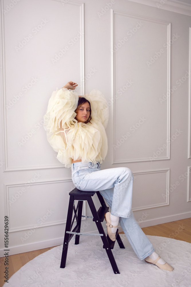 A portrait of a fashionable teenage girl in blouse and sneakers sitting on a chair in a studio on a light wall in a room. light from the window