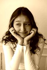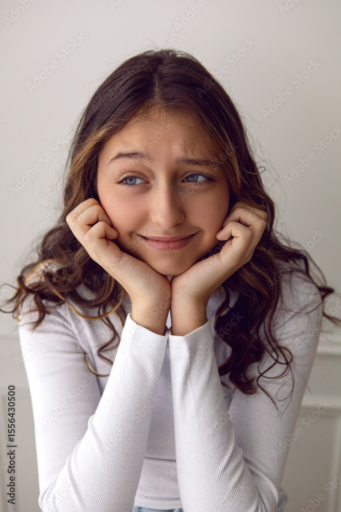 A portrait of a fashionable teenage girl in white clothes and sneakers dancing in a studio on a light wall in a room. light from the window