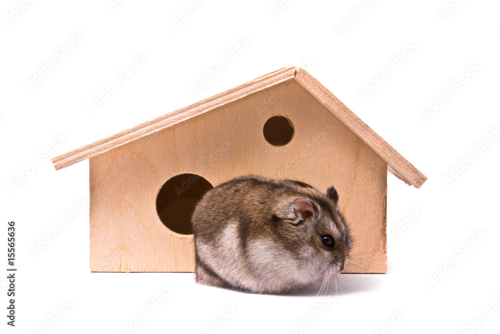 Dwarf hamster in house, studio shot, isolated on white