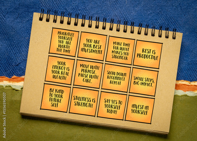 Invest time in yourself - a set of inspirational reminder notes with tips and guidelines in a spiral notebook