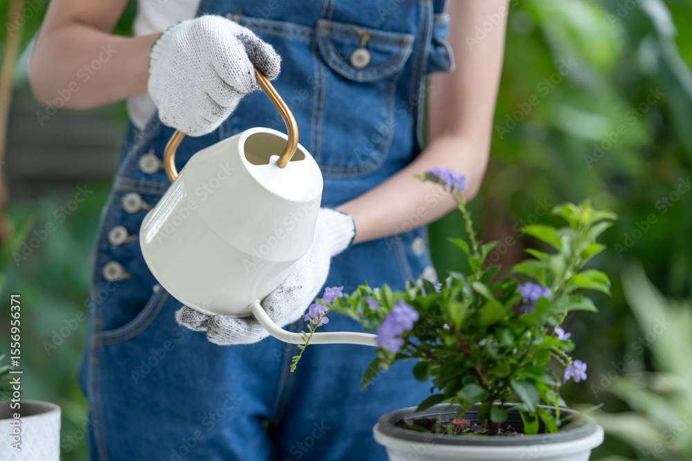 gardening home. woman use watering pot for tree in home garden. flowerpots as hobby and relax. plant sales, house garden, jungle, gardener, flower decoration, freelance, home jungle, Garden