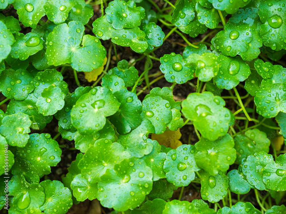 Centella asiatica, gotu kola green leaves fresh background, oraganic Leaf plant with rain water texture herbal asiatic raw food vegetable and medicine beauty cosmetic, gardent nature tropical summer.