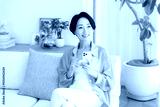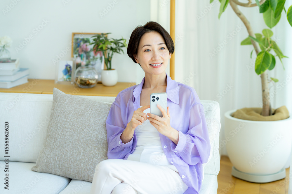 部屋でスマホを操作するミドル女性