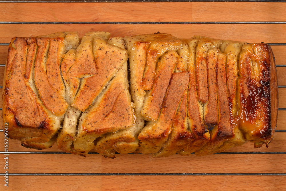 An overhead shot captures the underside of a freshly baked pull-apart bread loaf with a poppy seed, lemon, and cheese filling, resting on a cooling rack