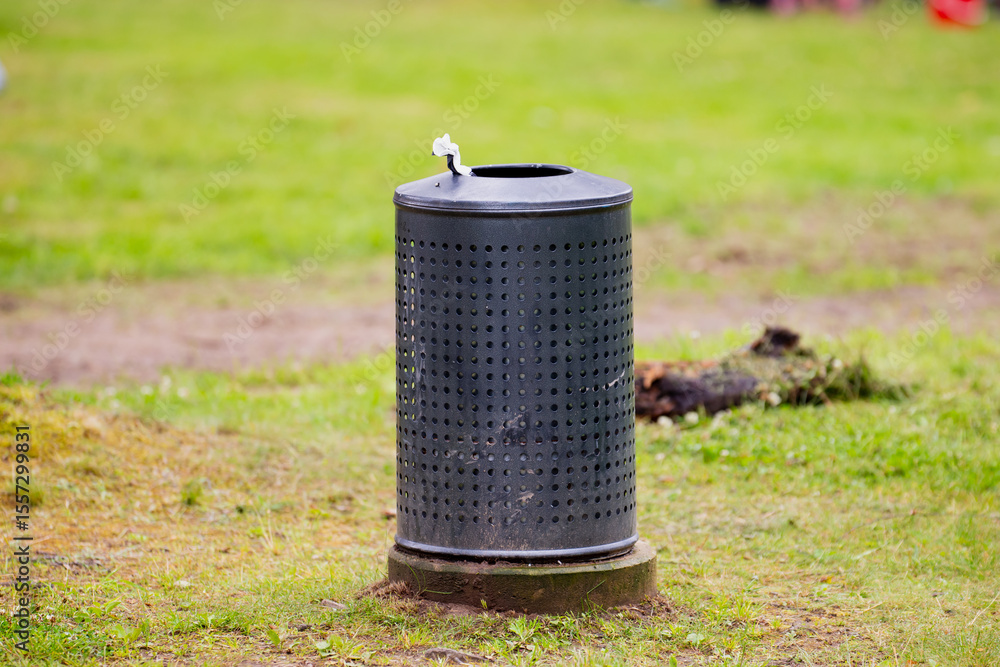 metal trash bin in public park on green grass waste container outdoor garbage can in city park environment cleanliness urban recycling bin eco friendly public space waste management background