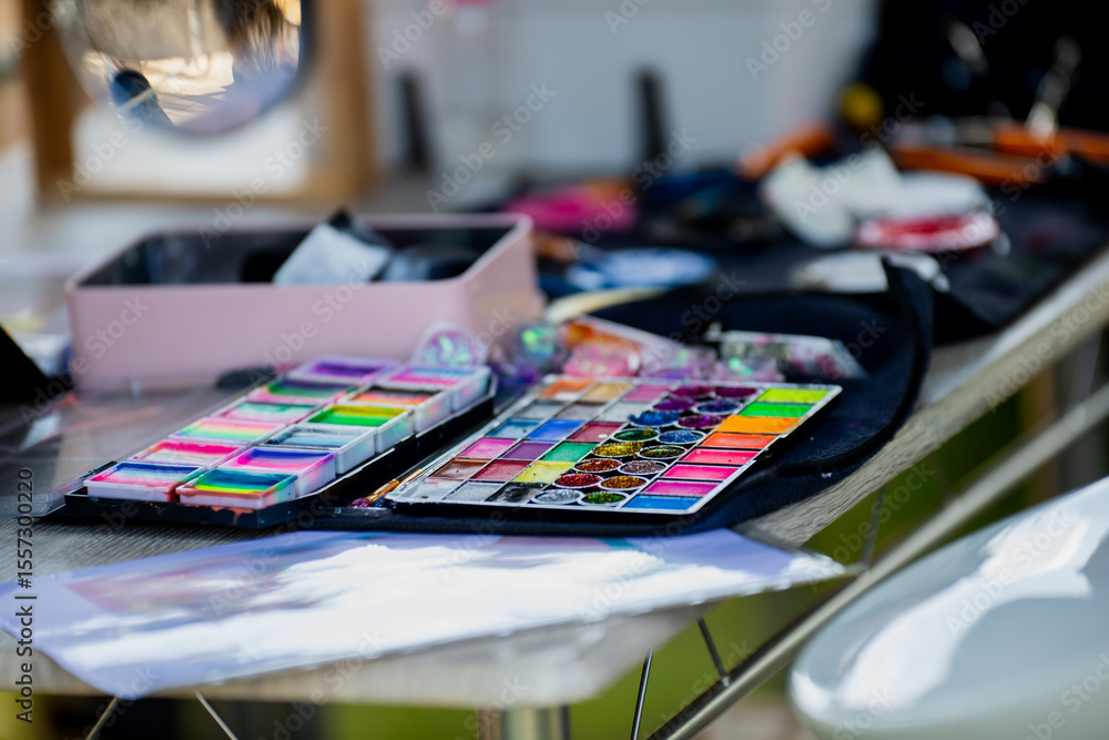colorful face painting palette on artist table during outdoor event with makeup accessories bright watercolors cosmetic tools festival preparation creative beauty art station for kids and adults