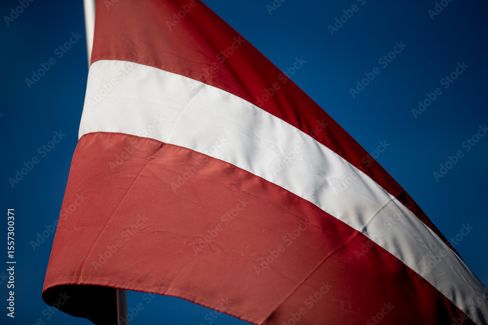 latvian national flag waving in wind against deep blue sky latvia independence patriotic symbol maroon and white banner close-up clear weather european country pride outdoor celebration
