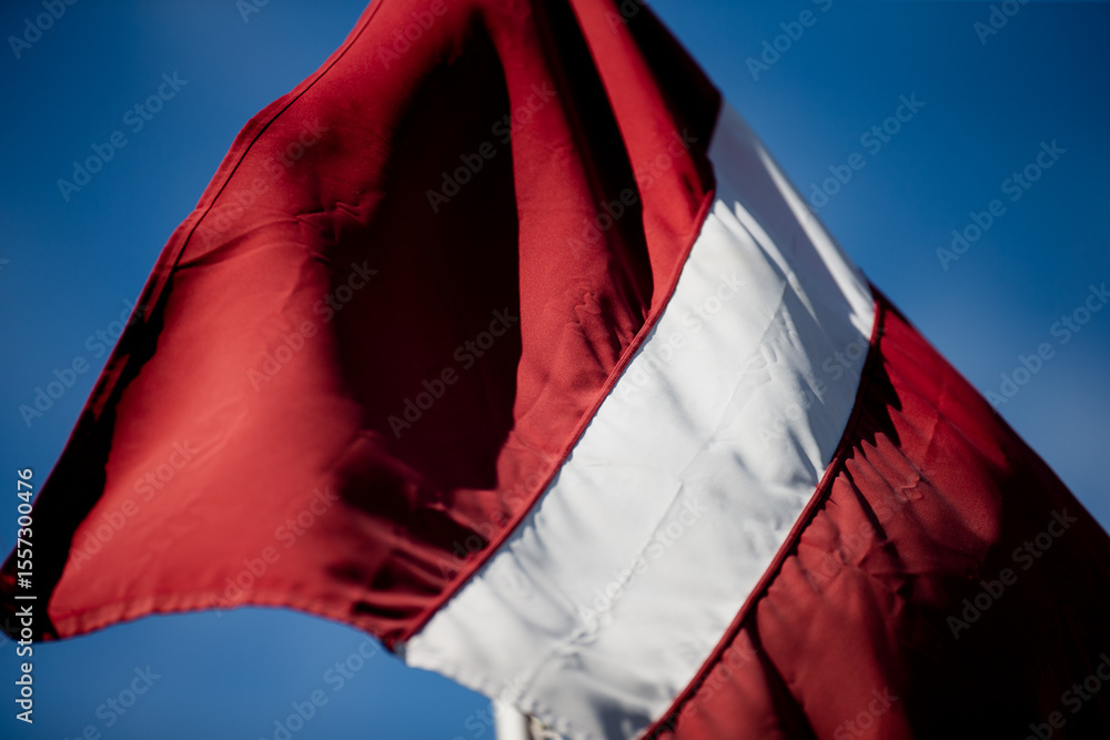 latvian national flag waving in the wind against blue sky symbol of national pride unity and freedom in europe powerful red and white colors representing latvia patriotism independence and identity