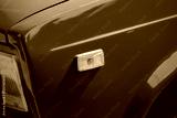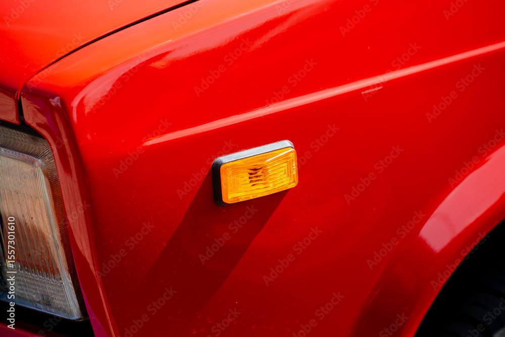 close up of red vintage car with orange side marker light and front fender detail under bright sunlight showing classic automotive design and vibrant retro color at outdoor automobile exhibition
