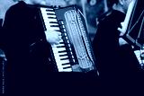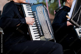 Musician playing accordion during live outdoor concert. Hands and black accordion in performance setting traditional folk music and classical instrument performance at public event