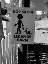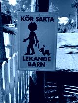 Schild auf Schwedisch "Vorsicht, spielende Kinder"
