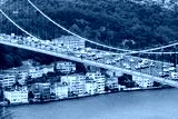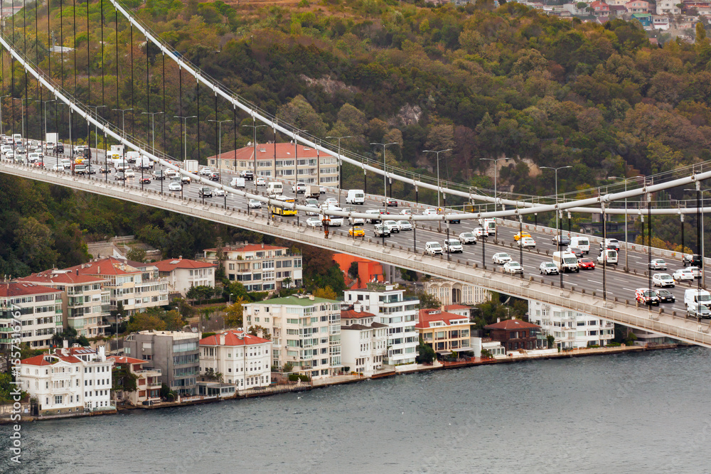 The Bosphorus Bridge, spans a body of water, packed with vehicles under an overcast sky in Istanbul. Residential buildings line the waterfront below, while a lush, green hill rises in the background.