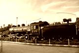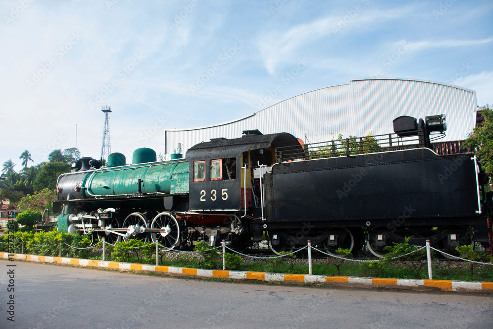 Antique model local bogie Steam locomotive on track railway for show thai people travelers travel visit at front of vintage building retro architecture of Chumphon train station in Chumphon, Thailand