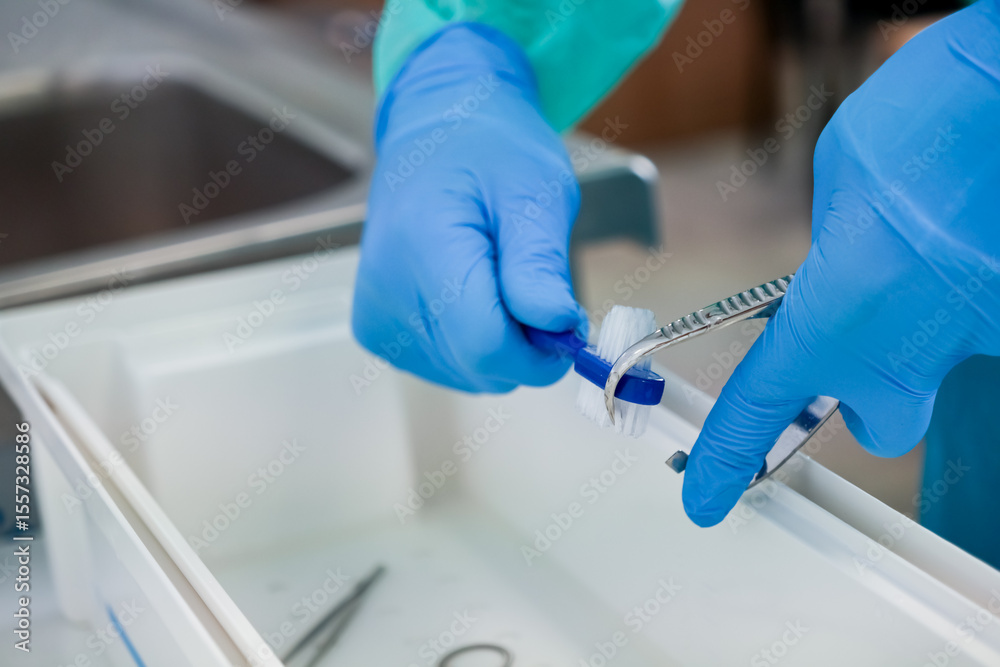 Hands in blue gloves meticulously cleaning a surgical instrument with a small brush, emphasizing sterile hygiene procedures and professional care in a hospital environment