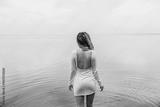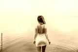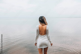 unrecognizable woman standing with back exposed in open white dress near calm lake, facing the water with relaxed posture and serene mood, concept of wellness, spa, fashion editorial