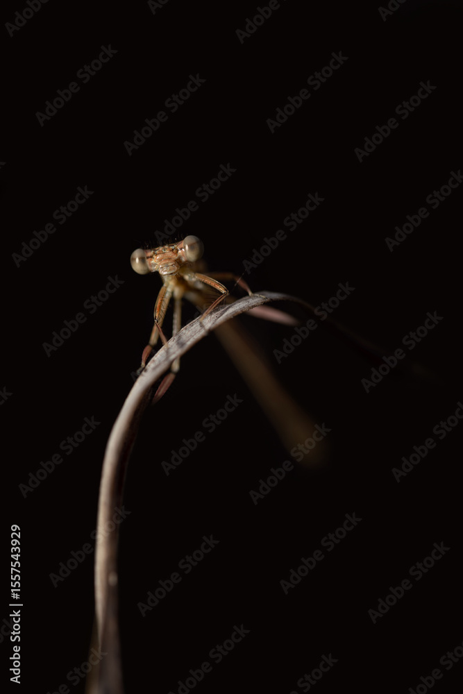 Close-up of a small brown dragonfly photographed from the front. The insect looks curiously at the camera. The background is dark.