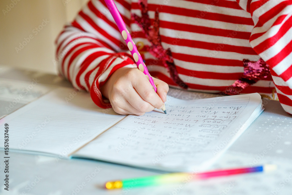 Close-up of Little girl writing with pencil. Small child doing elementary school homework. Education and learning concept.