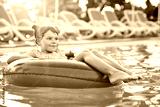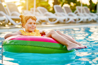 Happy little girl with inflatable toy ring float in swimming pool. Little preschool child learning to swim and dive in outdoor pool of hotel resort. Healthy sport activity and fun for children.