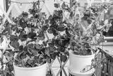Green pea plants with tendrils growing in white pots on balcony during rainy summer day. Sweden.