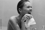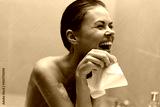 Happy young woman enjoying a relaxing bath, laughing joyfully while holding a cloth. Wellness and self-care concept in a cozy bathroom setting.