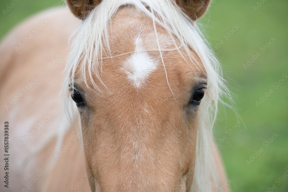 Portrait and close-up of a brown horse with a blond mane. The animal looks into the camera