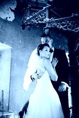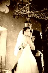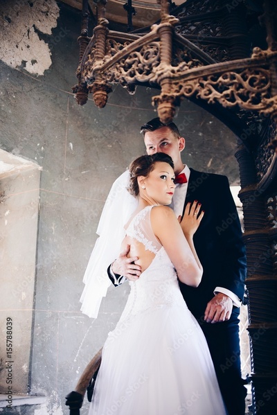Young Bride and Groom on old stairs. Wedding day. Wedding session