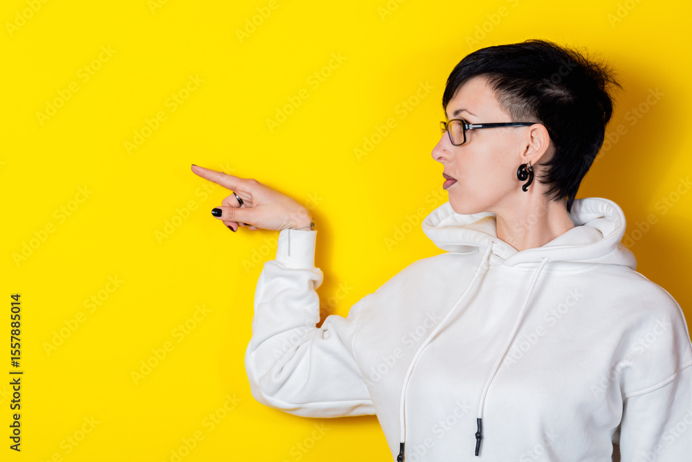Horizontal portrait of gothic young beautiful female model indicates with fore finger at blank copy space against yellow background