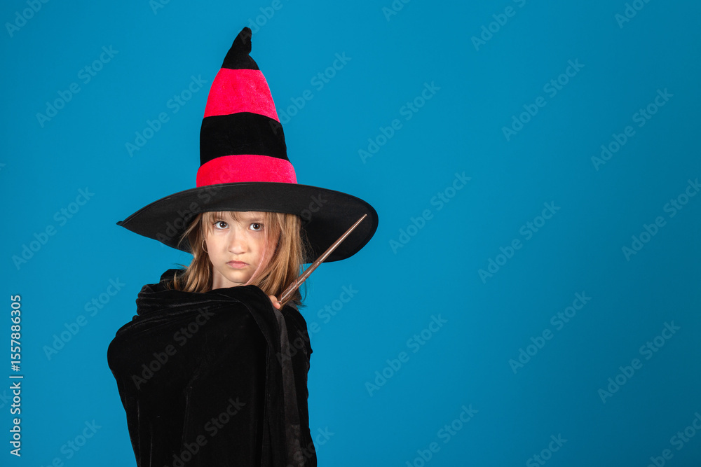 Halloween Theme. Young witch girl in black mantle and hat against blue background.
