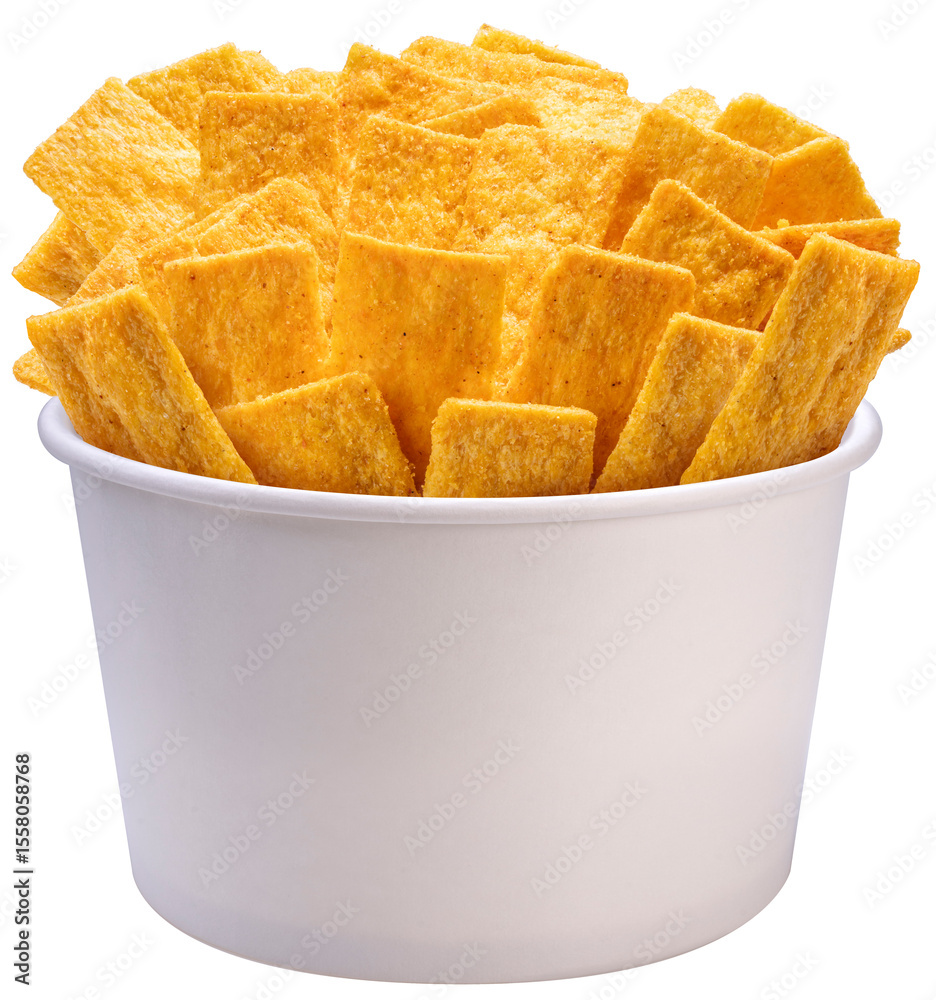 Corn chips Sichuan pepper flavor isolated on white background, Corn chips or Healthy Multi Grain Chips on white PNG File.