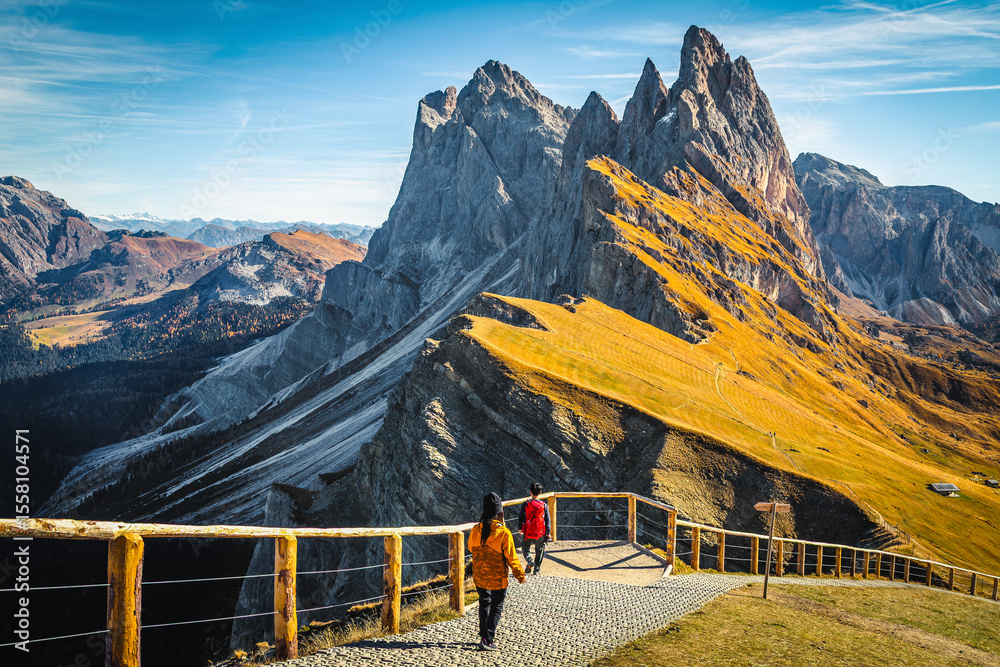 Beautiful viewpoint and hikers on the Seceda ridge, Dolomites, Italy