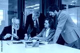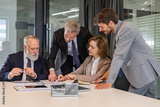 Four business people discussing work together using a tablet in a modern office