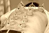 Close up for multiple vacuum cups, medical cupping therapy on human body. Doctor with cups for patient, therapy. Wellness, health injury rehabilitation concept. Alternative medicine